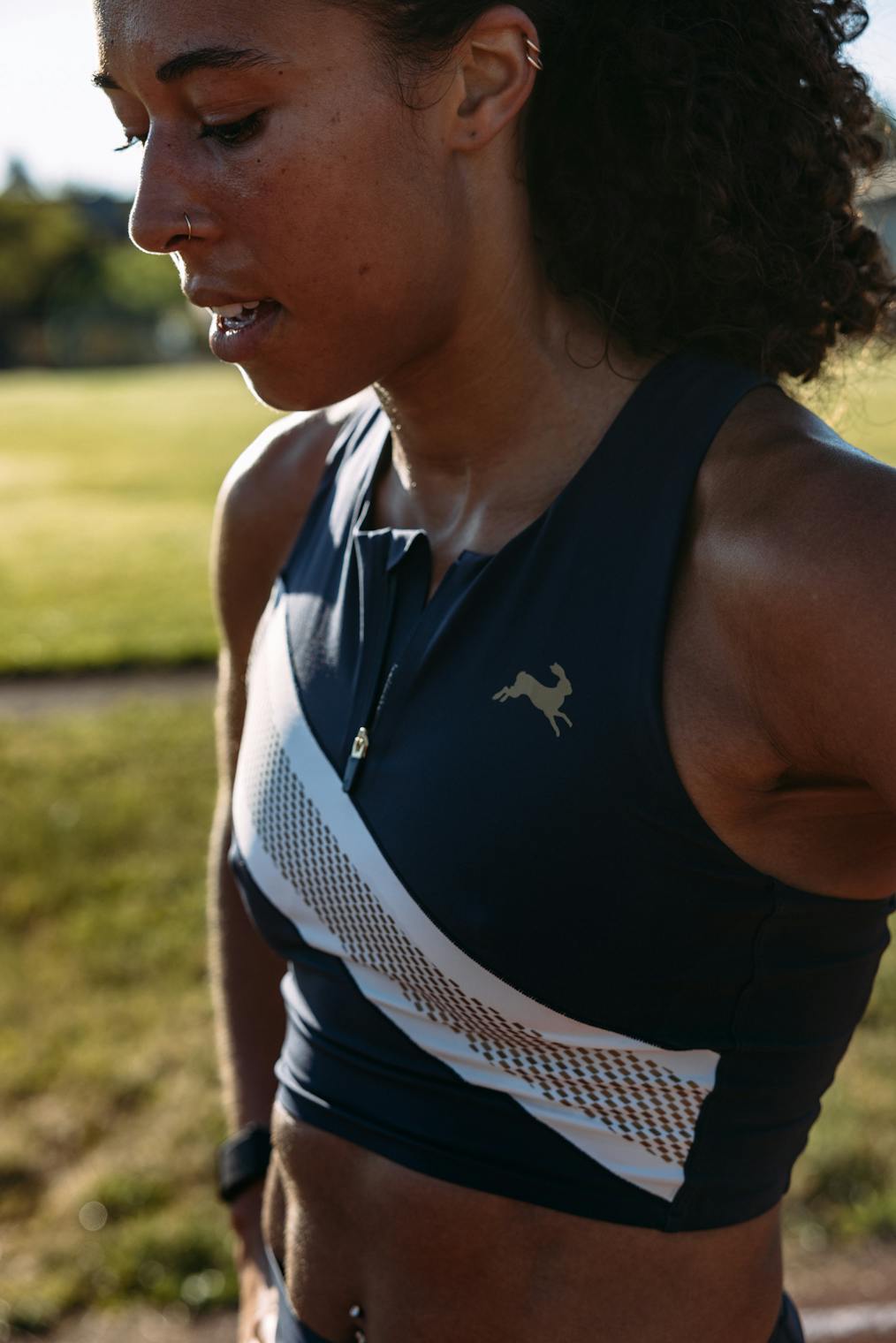 To feel secure at the starting line, the bra is made with a supportive, high-performance fabric that’s pilling-resistant, a two-layered support system with an integrated elastic band, and a quarter-zip at the neckline, both for styling and comfort.