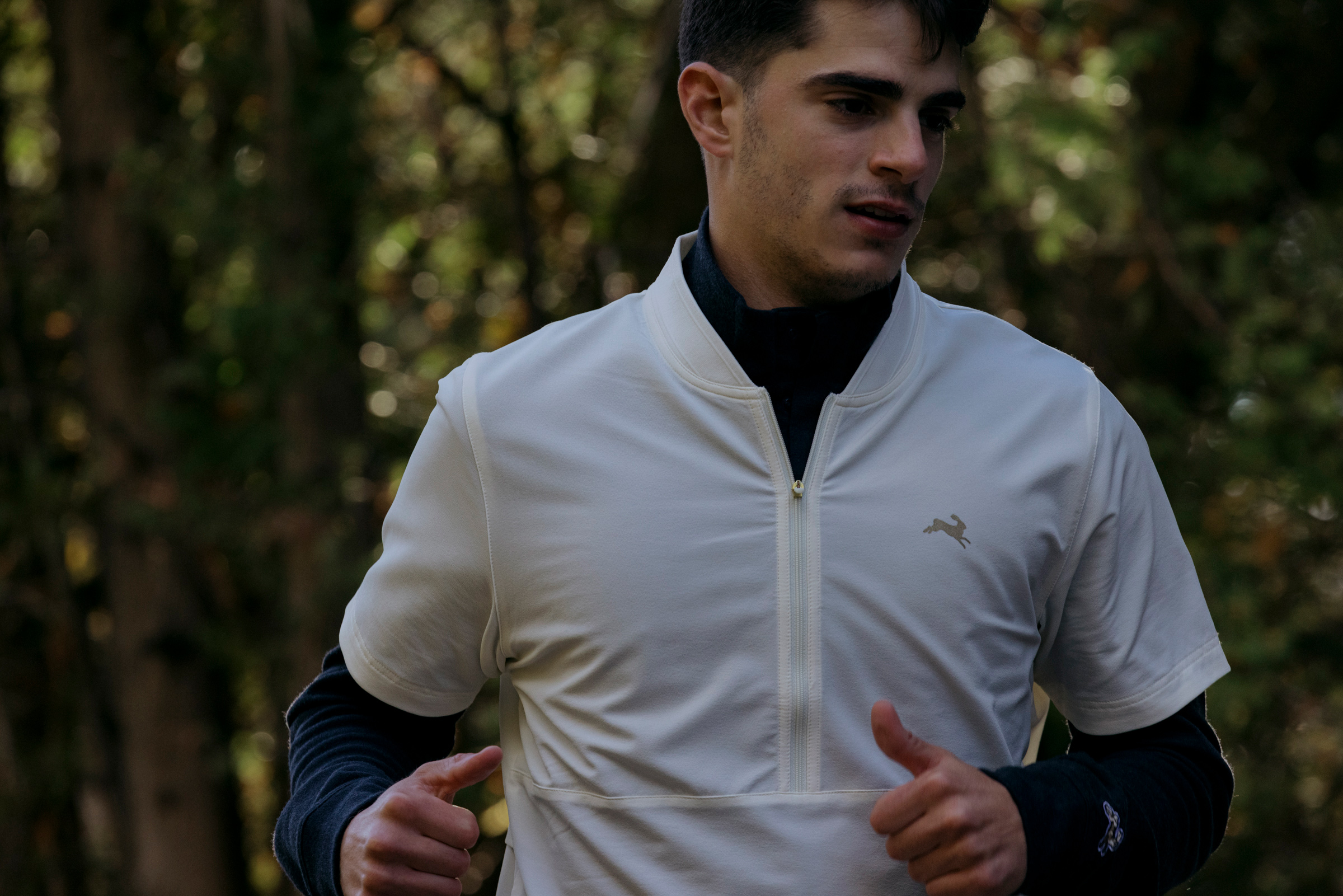 - A short sleeve, half zip silhouette with a ribbed stand collar