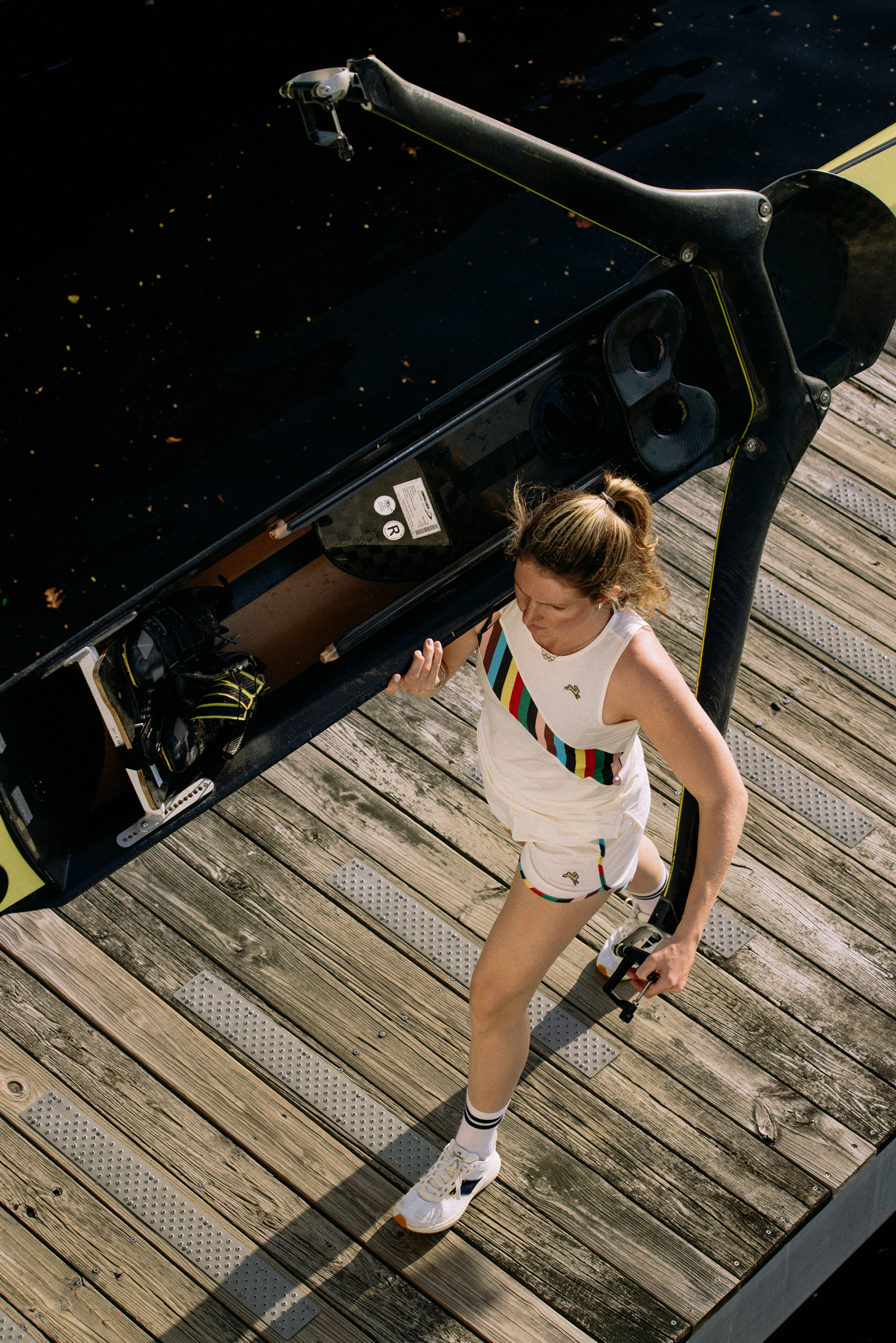 The efforts that depend on endurance are often as rough as they are rewarding. It takes a different kind of diligence to go the distance, one familiar to runners and rowers alike. Built to keep up with your cadence, whether on water or land, these shorts are crafted from a fine, featherlight Italian micro-mesh in a short and speedy silhouette with a dolphin hem detail. Featuring storage for fuel, an antimicrobial liner, and an internal drawcord, the classic running shorts are available in a limited-edition colorway that incorporates Rowing Blazer’s signature Croquet Stripe at the hem.