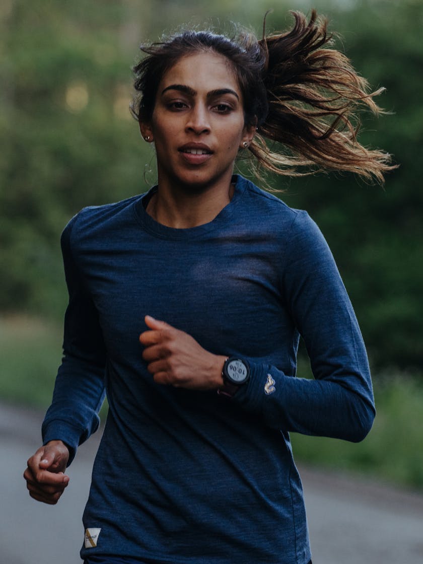 An odor-resistant, temperature-regulating long sleeve made with Merino wool.